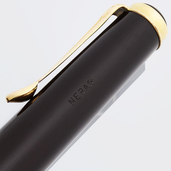 Condition Excellent condition. There is some fading on the piston knob, where there's a white cast on the surface. The barrel has great transparency, though it also reveals some ink staining inside. The cap is personalized with "NERAG". The trim is in good shape, mostly clean with just some brassing on the edge of the clip ring at the top of the cap, and on the cap band edges. The crown has some dings around the edges, and the cap "jewel" also has dents and scrapes around the perimeter. The filling system works very nicely. The end of the barrel, near the piston knob, is imprinted with "Gunther Wagner Pelikan" and is only worn a bit in the Wagner portion.