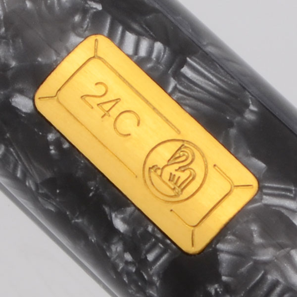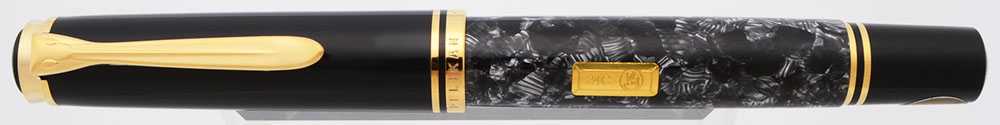 Color "Candy-striped" grey-blue barrel, with grey cap and piston knob. Gold-plated trim, including a 24-carat gold bar inset in the barrel. A real classic.