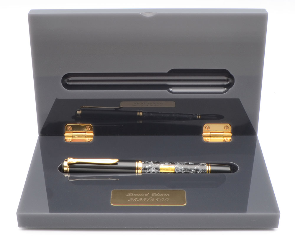 Condition Near mint in box condition with no cracks or notable scratches. Minor polishing marks. Nib size sticker still affixed to piston knob. Comes packaged in weighty grey acrylic box, inside of an outer cardboard box. The display box has some scuffs on it, but looks quite sharp and impressive.