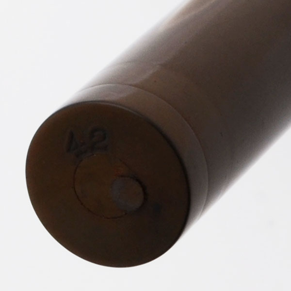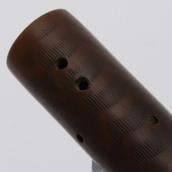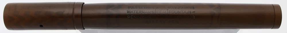Condition Very nice condition. The outer surface has a lot of fading, to a deep greenish brown, but the faded color is fairly even. Although the chasing is largely smoothed down, you can still see the pattern from both the texture and the color. There are two vertical holes on the cap where a clip previously attached. The imprint on the barrel is a bit worn, but still fairly easy to read. The safety mechanism is working very well.