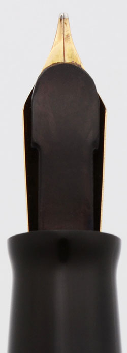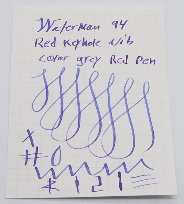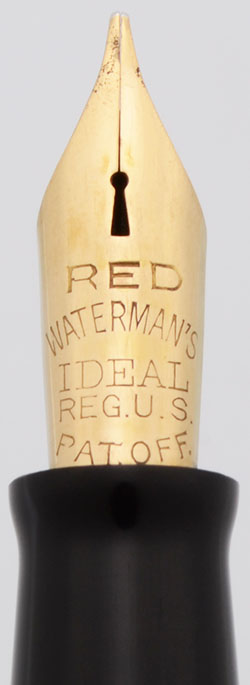 Nib Medium-fine nib is marked "Red Waterman's Ideal". It is nicely flexible with good ink flow. See writing sample below. NOTE: there is a hairline crack in the base of the nib, starting from the bottom of the "T" in "PAT. OFF." With normal writing and flexing, it should not grow, and it will not affect the pen's performance. However if the nib is pulled it could worsen. We show the crack in a close-up below.