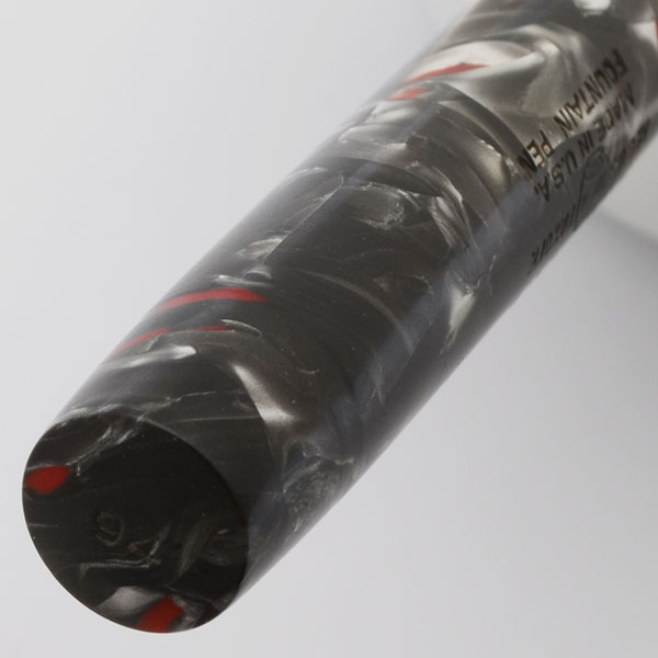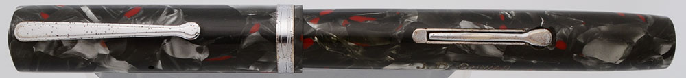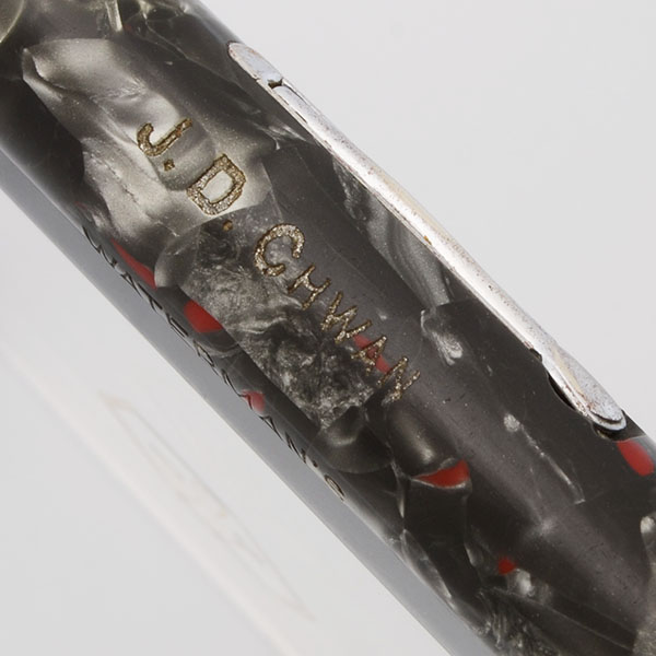 Condition Very nice condition with no chips or major scratches. The plating is typically thin, and the clip, cap band, and lever all have brassing and pitting. The imprints are very good. Nicely flexible nib that will give you a lovely writing experience. The barrel is personalized with the name "J. D. Chwan", which is largely camoflaged in the marbled patterning on the barrel. The crack in the base of the nib (mentioned above in the "Nib" section) seems stable.