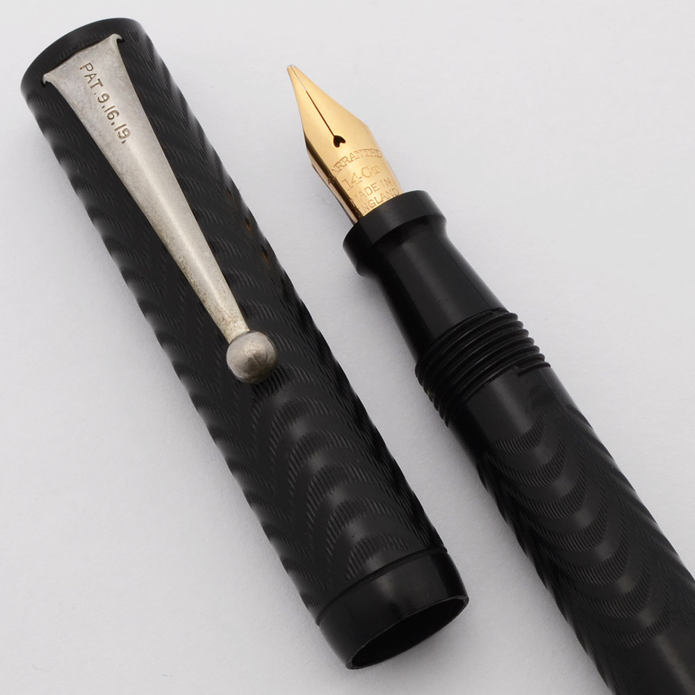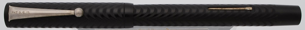 Color Black chased hard rubber with nickel plated lever and clip.