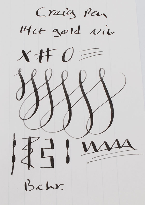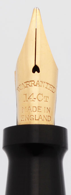 Nib FINE FLEXIBLE 14k warranted nib made in England. Excellent line variation from fine to broad with hardly any pressure. Please see the writing sample below.