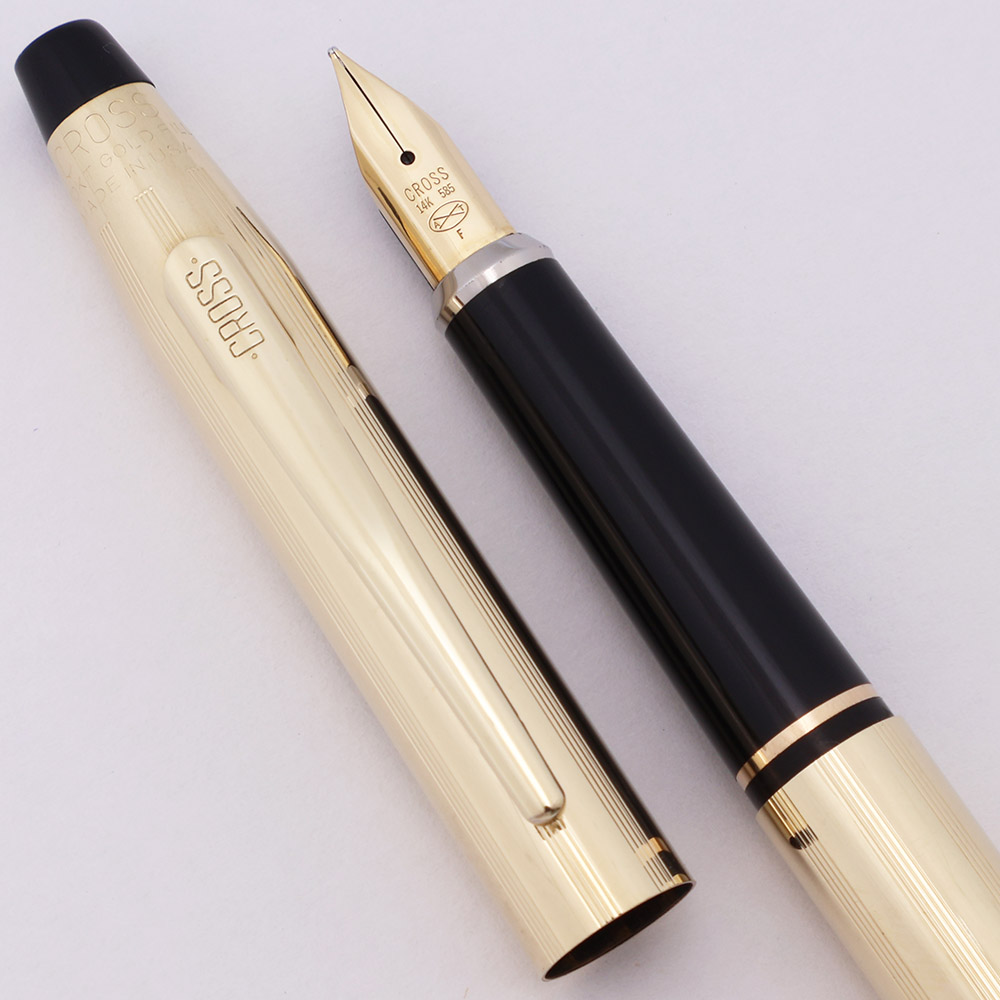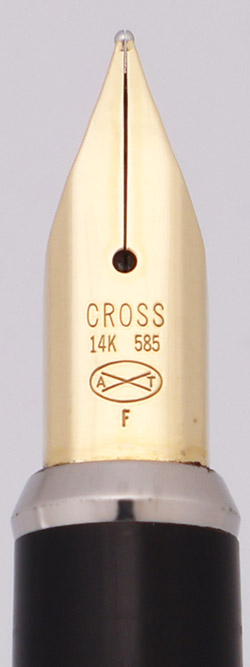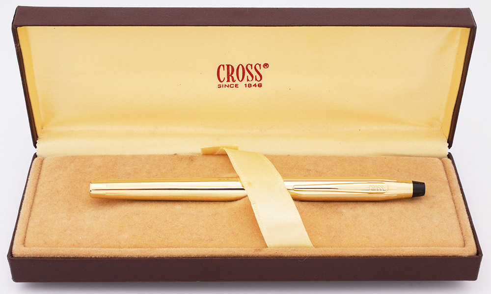 Condition Excellent in box, with paperwork and with no cracks, chips, dents, or dings. This is a slim, shiny pen with classic Cross styling. The cap and barrel have microscratching. The section has moderate scratching. There is some plating loss on the section ring near the nib. The clip has microscratching. The imprints are clear.