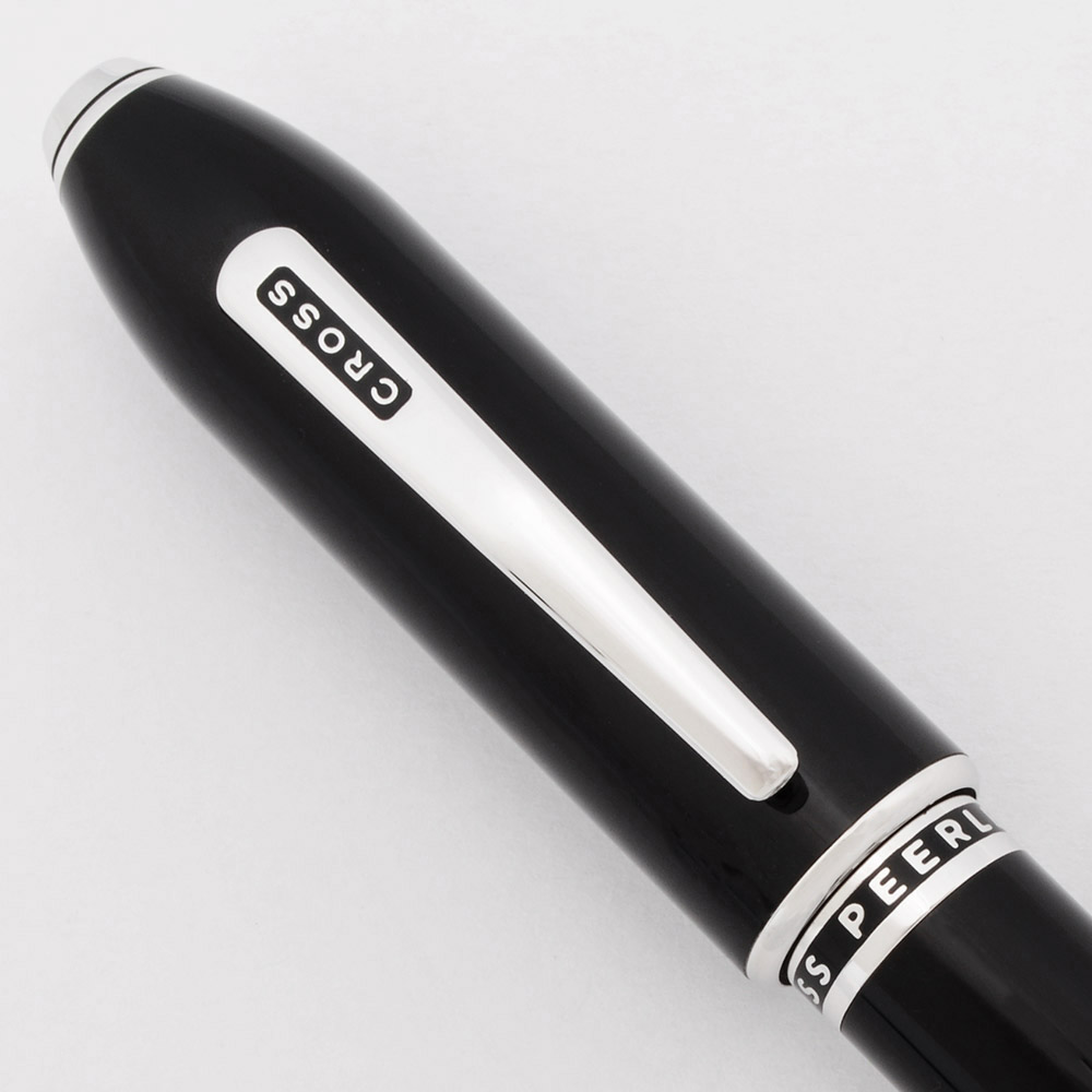 Condition Excellent + condition in large gift box that includes a clear 2-1/16" x 2-1/6" x 1-1/16" acrylic pen holder with the Cross label as well as paperwork. This is a large sized pen that is impressive. The black coloring is velvety and the pen is shiny and attractive. There is some light signs of usage on the cap and barrel. The cap has a bit of surface wear just above the cap lip. There is a small nick to the left of the clip (see photo below). All imprints are clear.