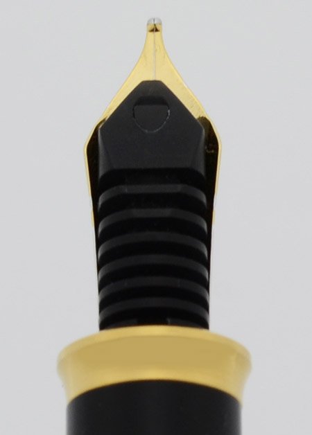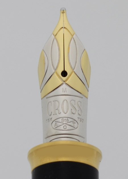 Nib Medium 18k two tone nib. The M is a bit hard to notice with all the decorations on the nib, but the nib is labeled. It's quite smooth.