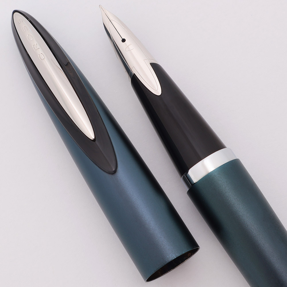 Condition Near mint condition with no cracks, chips, dents, or dings. This is a large-size, impressive looking pen in a matte dark blue color and with a unique clip. The cap and barrel look fantastic, with no visible marks or interruptions in the surface. The section has some scratching from the cap lip. The clip has microscratches along the top edges. The Cross imprint is clear.