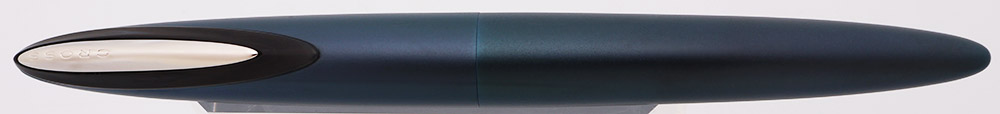 Color A deep blue color that might be Selenium Blue, but it's difficult to find much information on these pens. It's a very dark teal blue color with a matte/satin finish. Shiny silver clip is framed by a translucent gray plastic. (You press the top of the clip and it extends a bit.) Black section with inlaid nib.