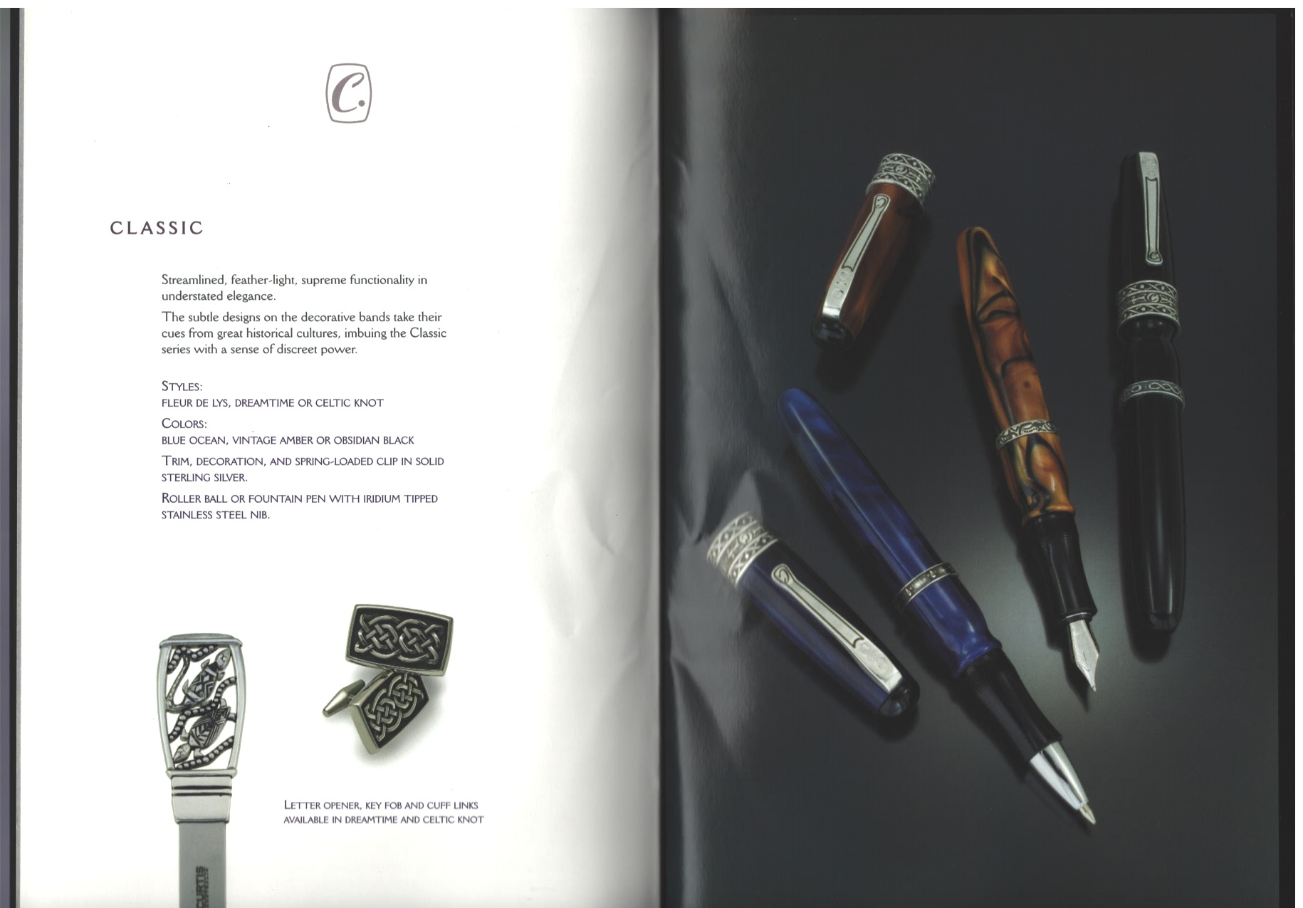 Color "Dreamtime" is what Curtis calls this style of the Classic model, and is characterized by the pattern on the barrel band. The body and cap are made of resin. There is also an elaborate sterling band on the cap lip. In this iteration of the model, as designated by the pattern on the barrel band, we have color options of Blue Ocean, an elegant deep blue marbled resin, Obsidian black, and Vintage Amber, a marbled amber brown with black swirls. Select your desired color from the drop-down menu.