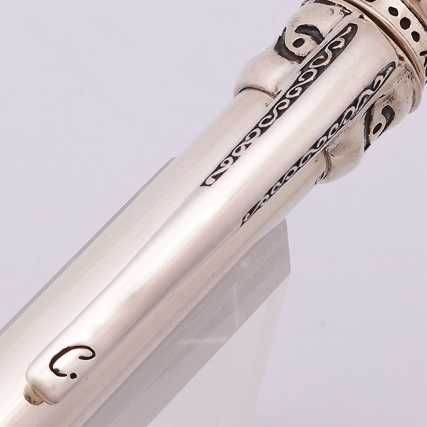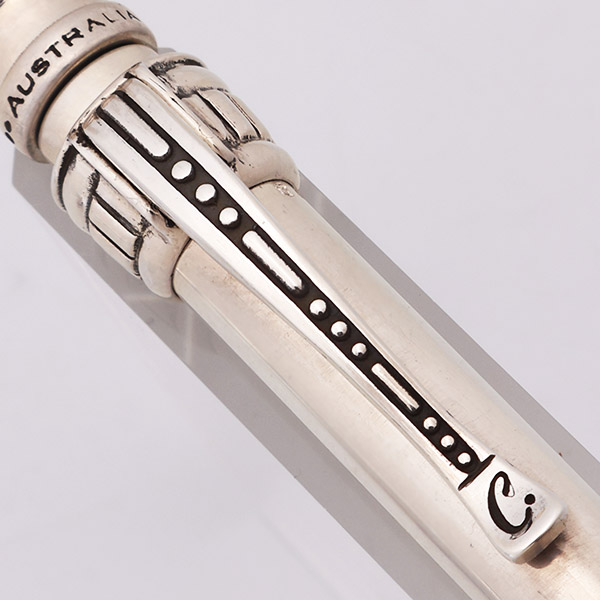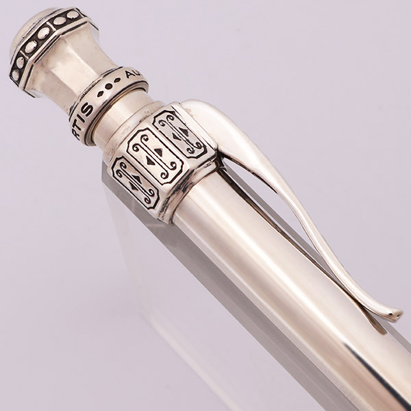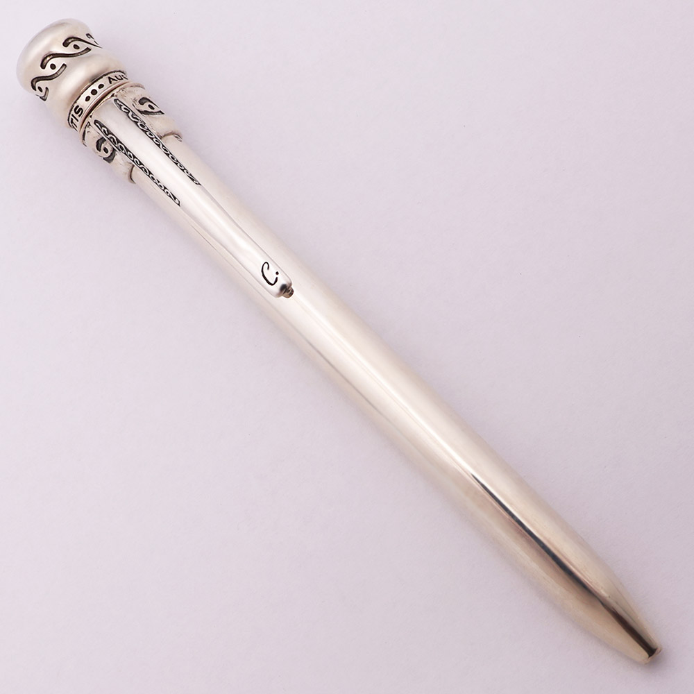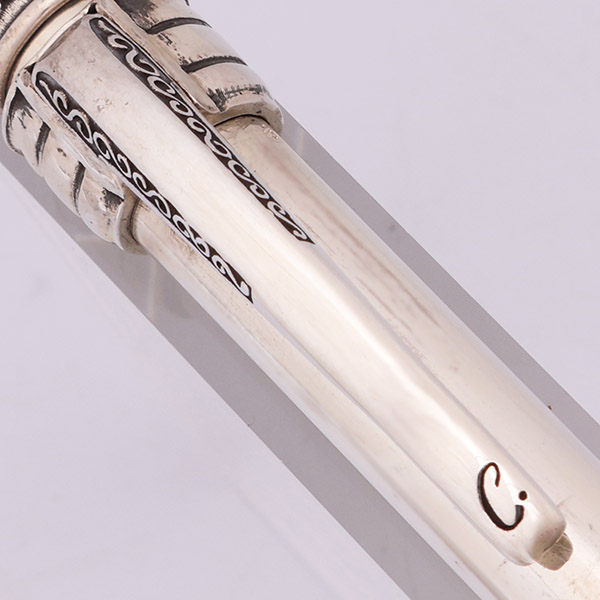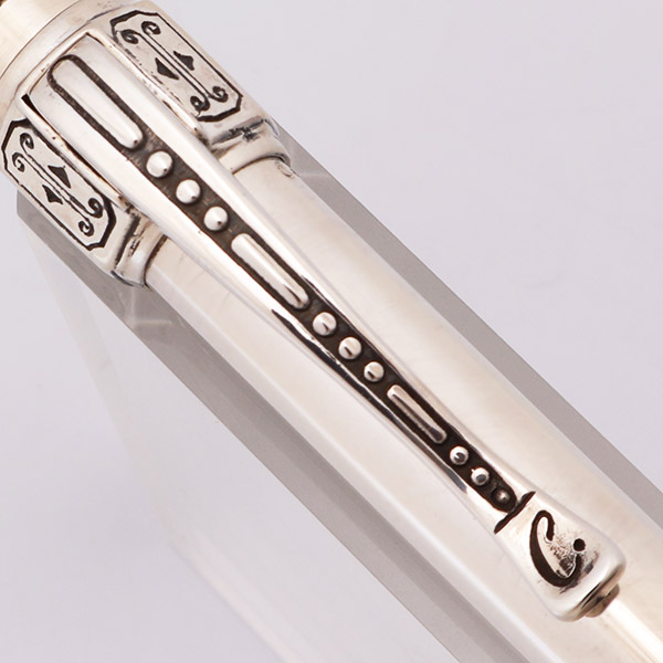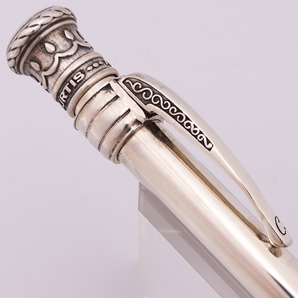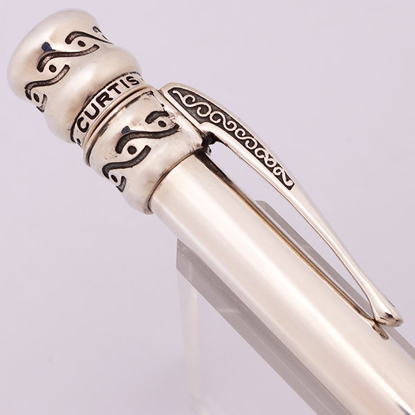 Color Solid sterling silver. The pen has a simple barrel with an ornate top and clip. There are 4 difference designs, each with a unique clip.