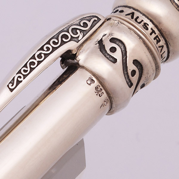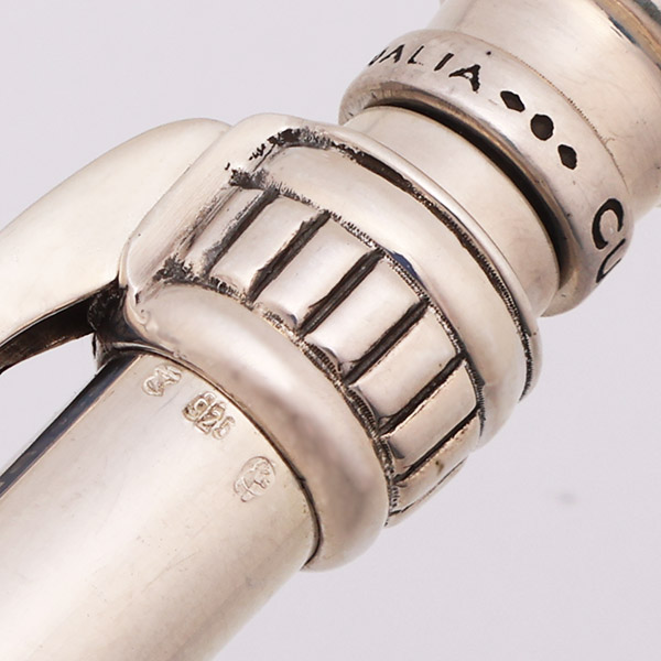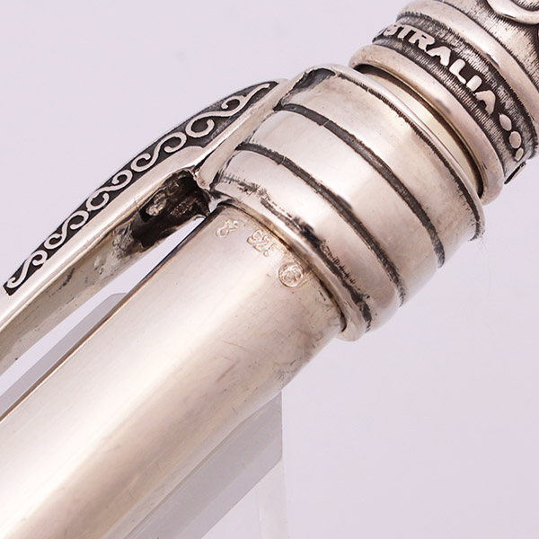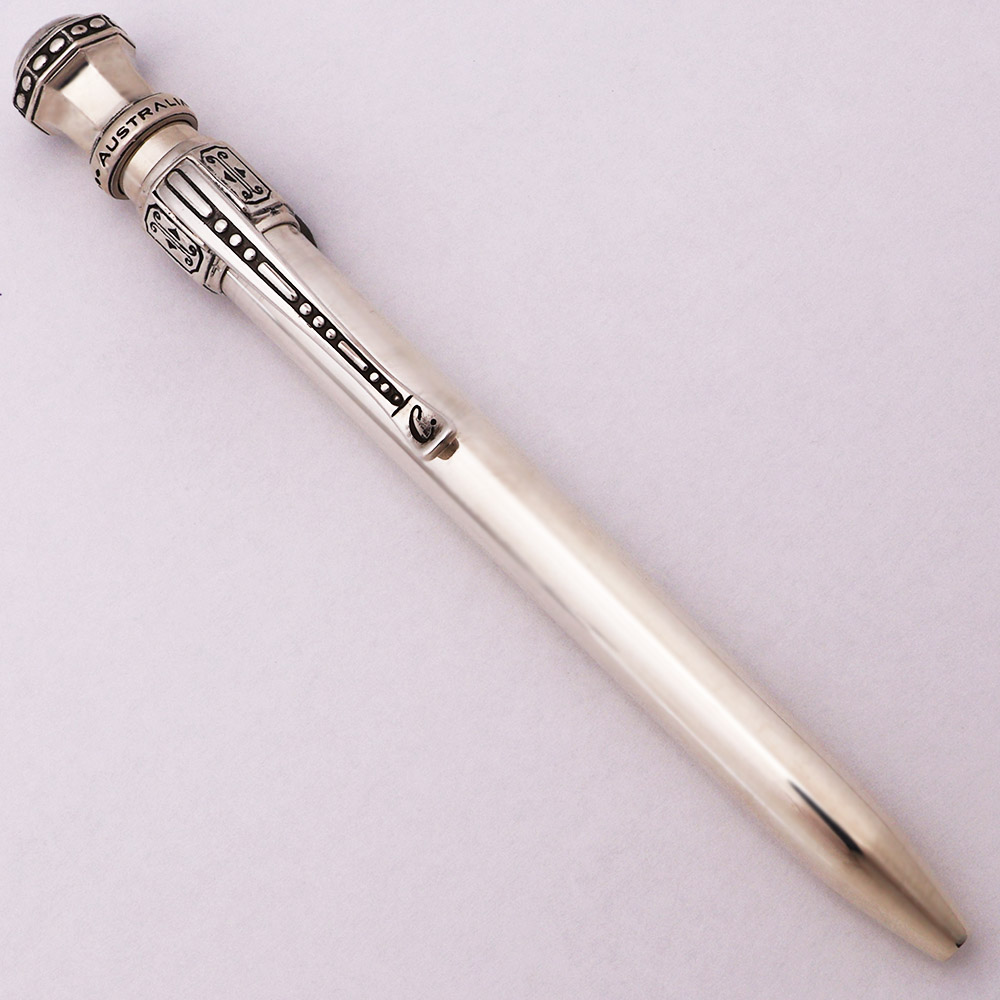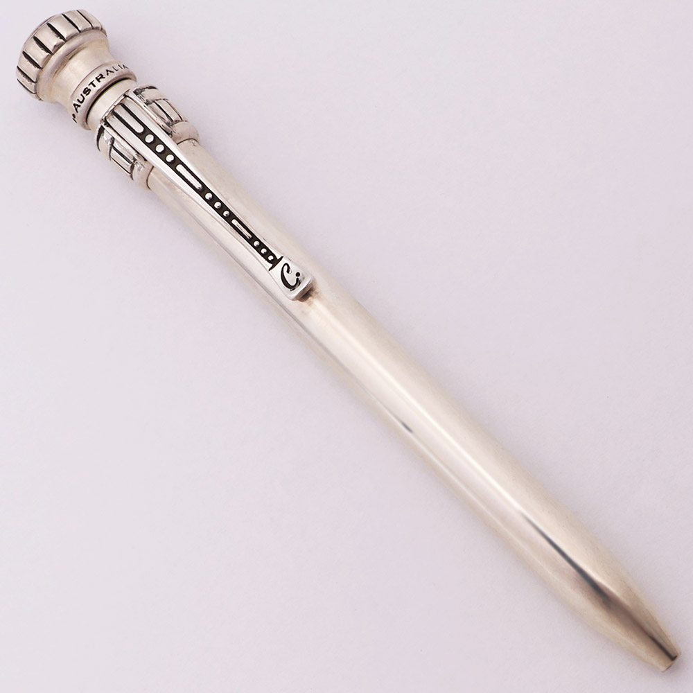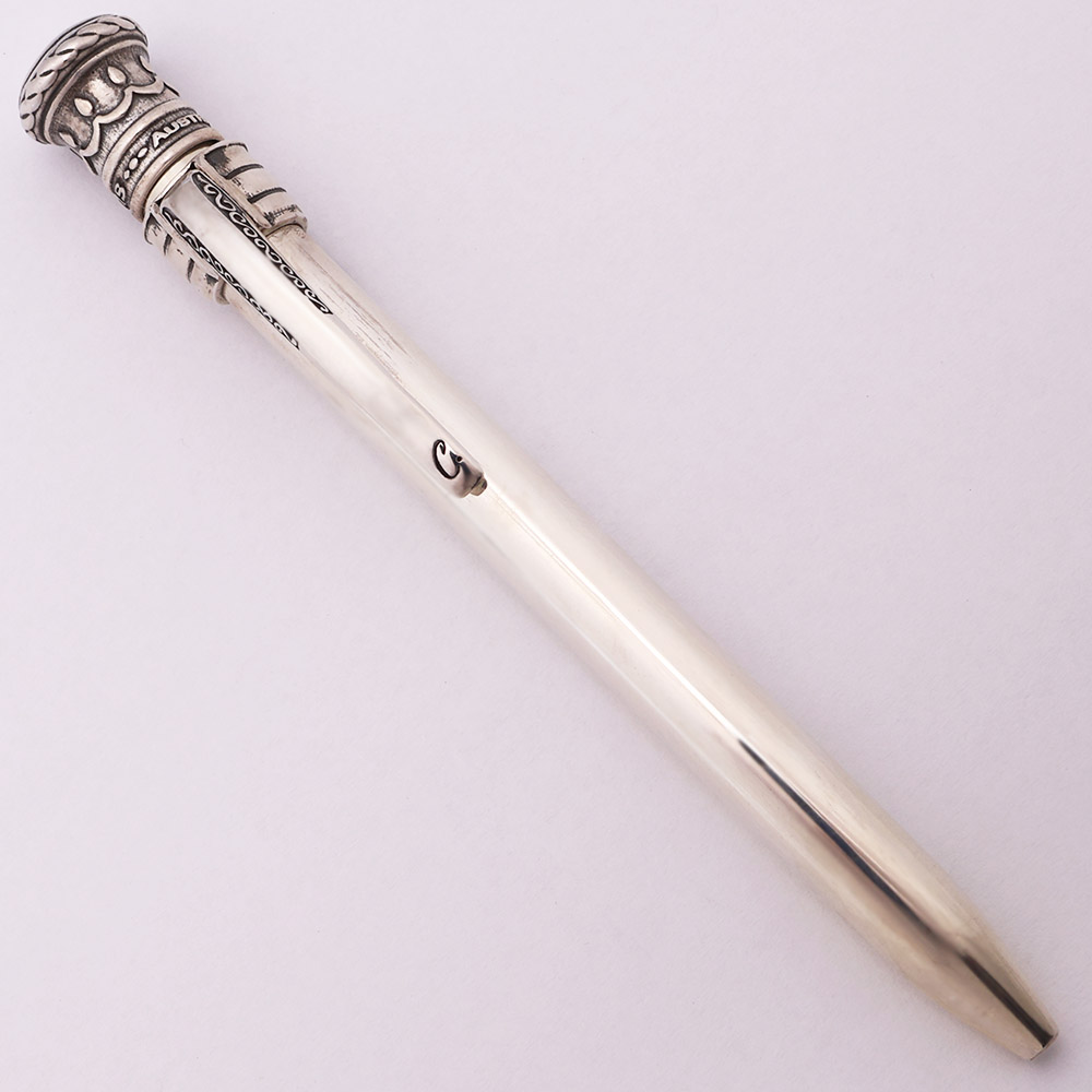 Color Solid sterling silver. The pen has a simple barrel with an ornate top and clip. There are 4 difference designs, each with a unique clip.