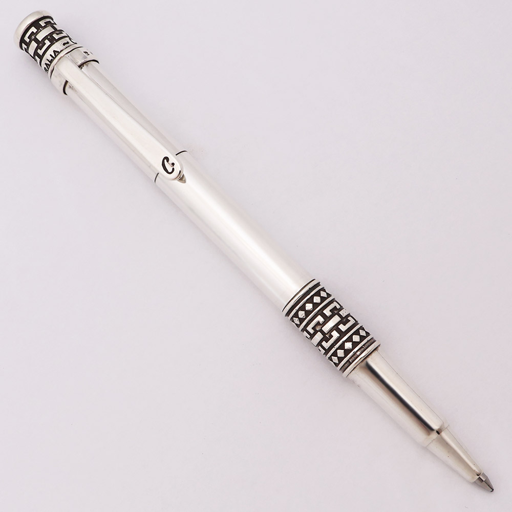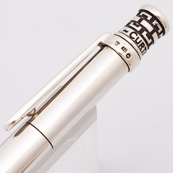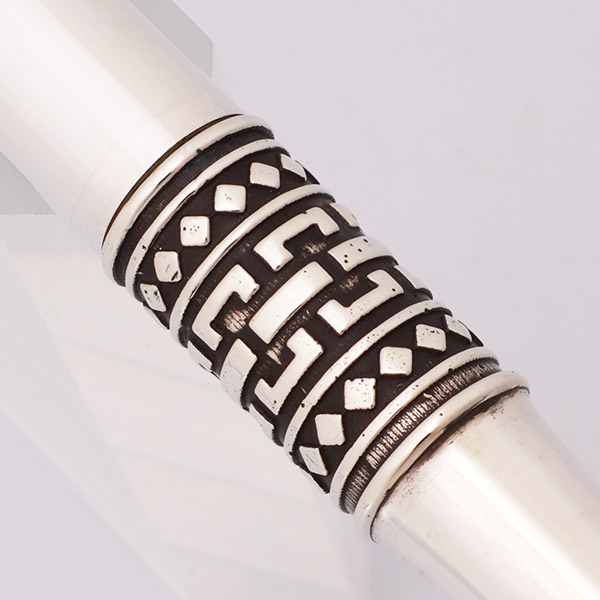 Color Solid sterling silver. The pen has a fairly simple barrel with an ornate top and band near the tip. This is the Terrazzo design, with the bands featuring a "terrazzo" pattern of small silver "chips".