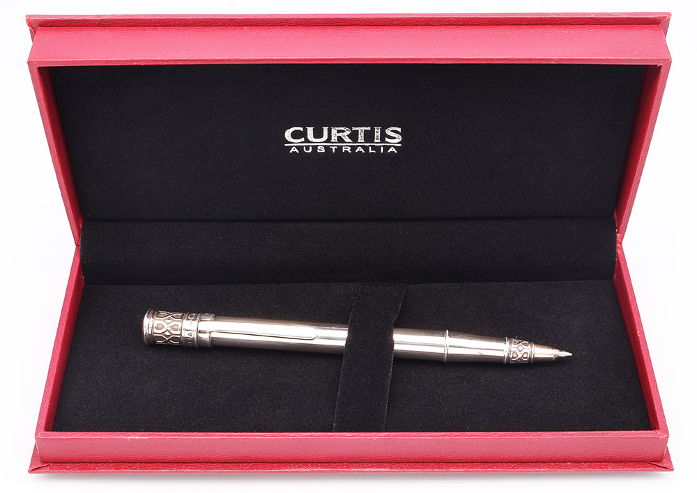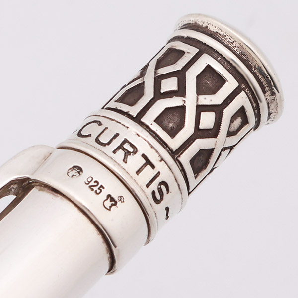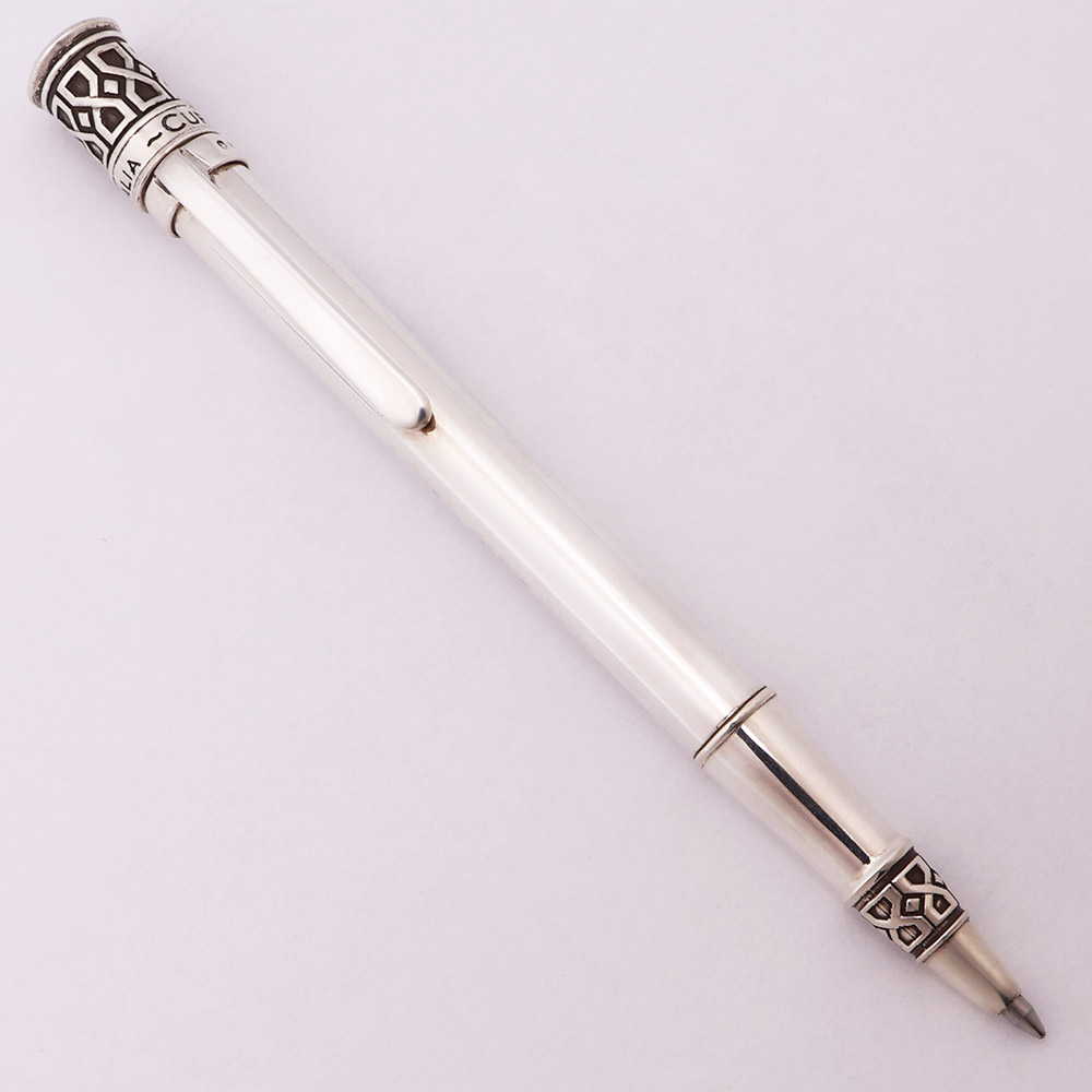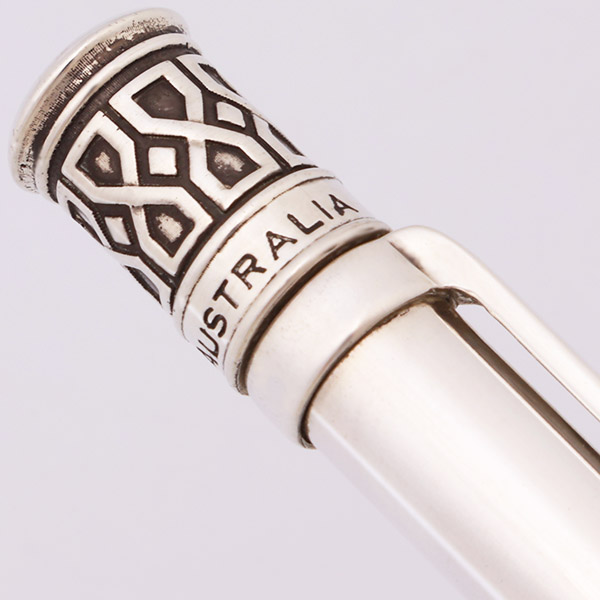 Color Solid sterling silver. The pen has a fairly simple barrel with an ornate top and band near the tip. This is the Weave design, with the bands featuring a geometric interlocked pattern.