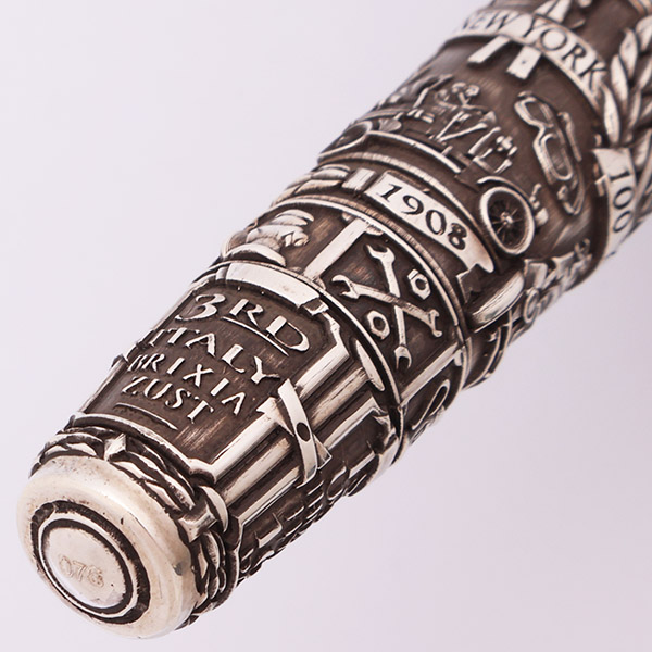 Condition New old stock condition with no cracks, chips, dents or dings. This is a unique, very heavy, highly decorated, commemorative and limited edition pen (#076). All imprints and hallmarks are clear. The cap and barrel look excellent, with all the deep engraving intact and impressive. There is light tarnish marks as well as microscratching on the cap band area and on the clip. The end or the barrel where the limited edition numbering is has light scratching. No box or paperwork.