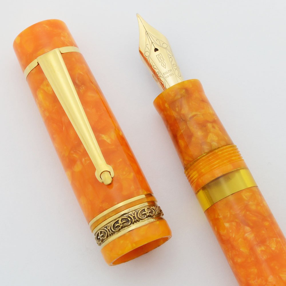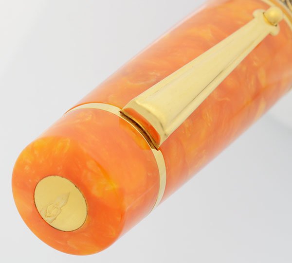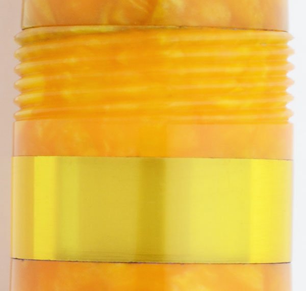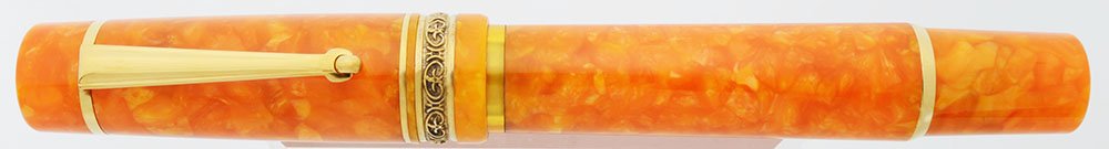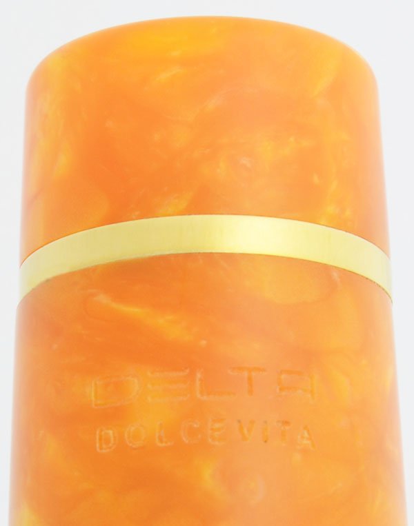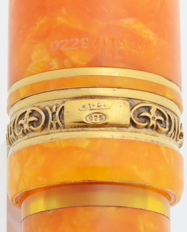 Color Bright cracked ice resin. It is a golden orange called, "oro" or gold. Dolcevita pens usually have black resin caps and this golden resin is used only for the barrel. This is the all gold version. The trim is gold plated including the cap band which is sterling with gold plating, vermeil.