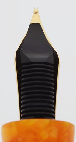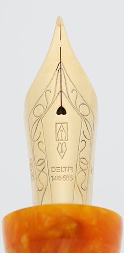 Condition Near Mint condition. The pen has no handwear and the gold plating looks perfect. The vermeil cap band has one area with minor marks on it. There is one mark on the section that you can feel with your nail and it is slightly discolored. The pen ships in its box with paperwork and a bottle of Delta ink. No cracks or chips. The piston works well. There's small amounts of the resin that are discolored, as yellow stains easily, but it's not particularly noticeable.