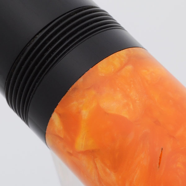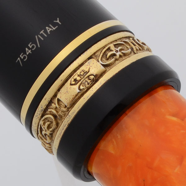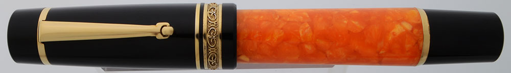 Color Beautiful marbled orange resin barrel. Black cap, blind cap, and section, with gold-plated trim and an elaborate vermeil cap band.