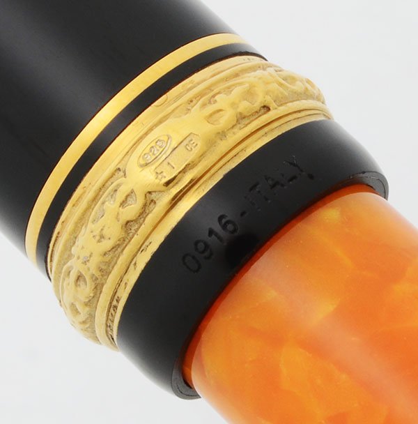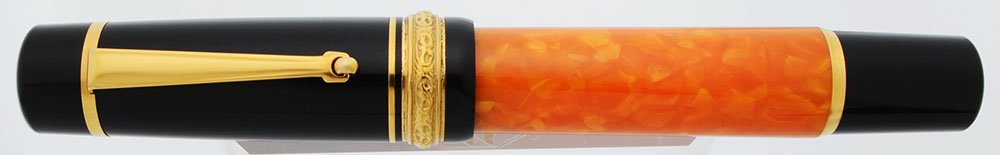 Color Beautiful marbled orange resin barrel. Black cap, blind cap, and section, with vermeil (gold over sterling) trim.