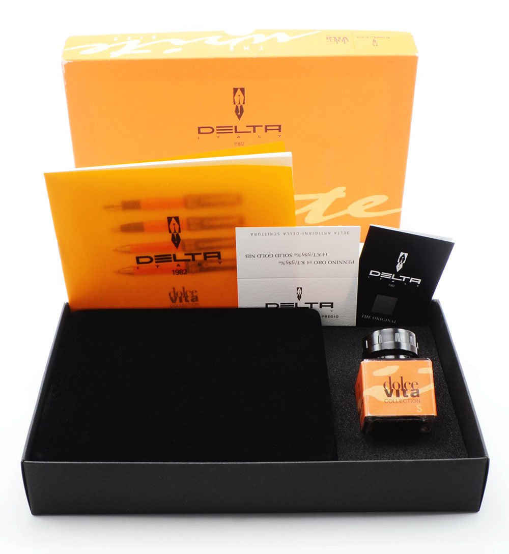 Condition Near mint condition, in box, with Dolce Vita ink bottle. No cracks, chips, dings, or dents. This is a large, impressive, beautifully colored, shiny pen. Microscratching on the cap and barrel and horizontal capping lines on the barrel. The trim is pristine and beautiful. The imprints are clear. We've seen this pen packaged with a pen tray and eyedropper, but this is the simpler packaging.