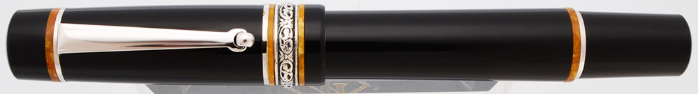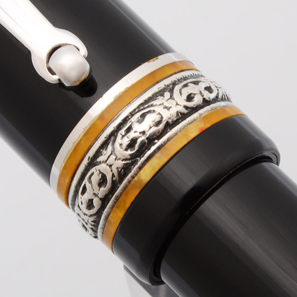 Color Shiny, velvety black cap and barrel with orange marble bands above the faux blind cap, surrounding the sterling silver ornate cap band, under the barrel threads, and just above the clip mounting. Shiny chrome clip.