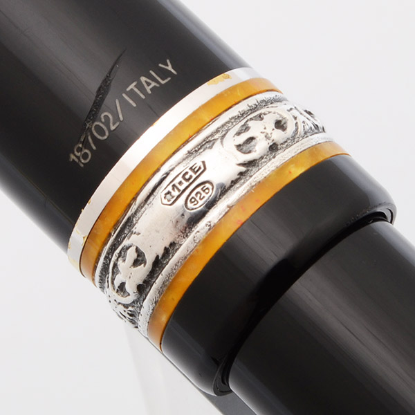 Condition Excellent condition with no cracks, chips, dents, or dings. This is a chunky, velvety black, shiny pen that has elegant design features. The cap and barrel have light microscratching here and there. The only flaw is a scratch that goes over the Italy imprint on the cap (see photo below). The ornate sterling silver cap band and shiny chrome clip are lovely. The imprints are all clear. No box or paperwork.