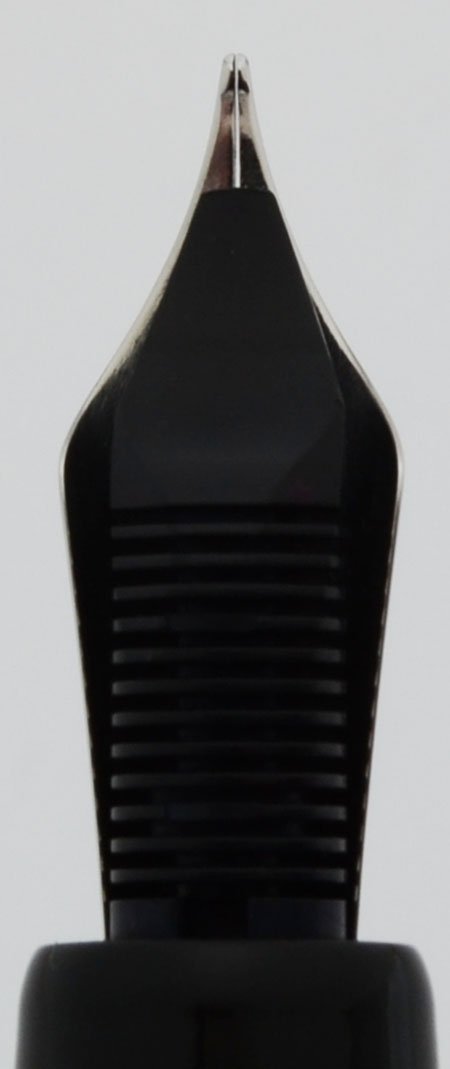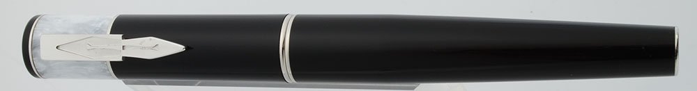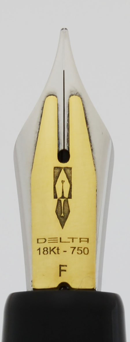 Nib Fine two tone 18k fusion nib. Fusion nibs are steel nibs with a gold plate attached to the surface. They are intended to write smoother than steel Delta nibs and to change the feel of the ink as you write. Very smooth with all of its tipping material.