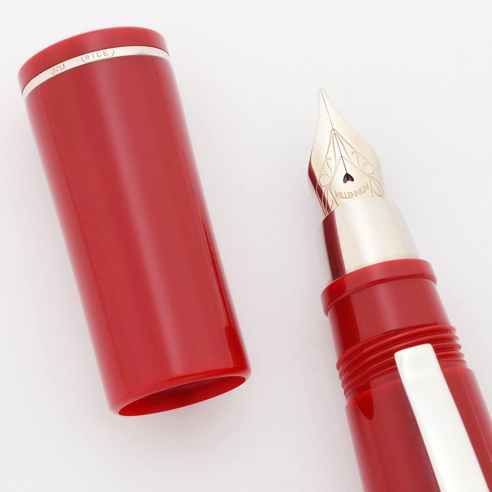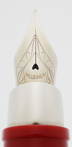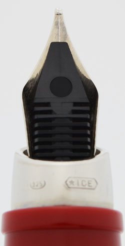 Nib Medium 18k nib. The nib size should be labeled near the base of the nib but we didn't want to unseat it. The nib has a bit of a left foot oblique shape to it and fine scratches on the face. The nib has silver colored masking which is probably rhodium.