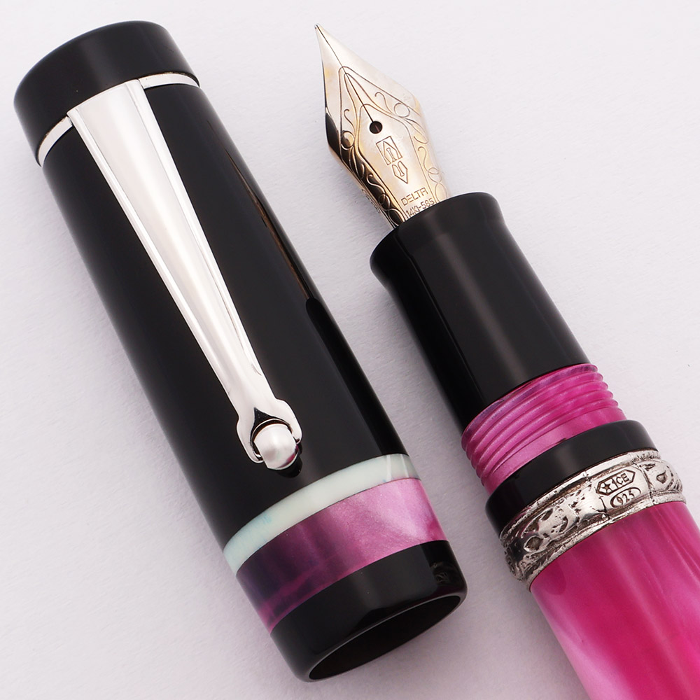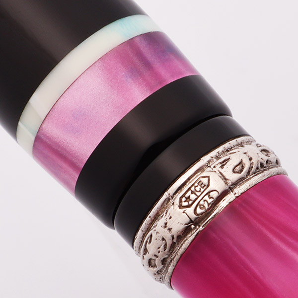 Color Pink swirl barrel has pearlescence. The barrel has a black end piece. Black cap with a white stripe and a pink stripe followed by a black stripe that is the cap lip. 3/16" decorated sterling silver band at the top of the barrel. Chrome clip.