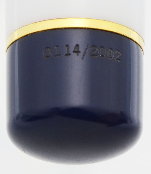 Condition Superior condition. The pen has no usage signs and no cracks. White resin stains easily but the pen is clearly white. The imprints aren't completely clean but they're clear and easy to read. The cap has handwear with polishing marks on the vermeil trim. Some of the gold plating is coming off of the cap band. No scratches.