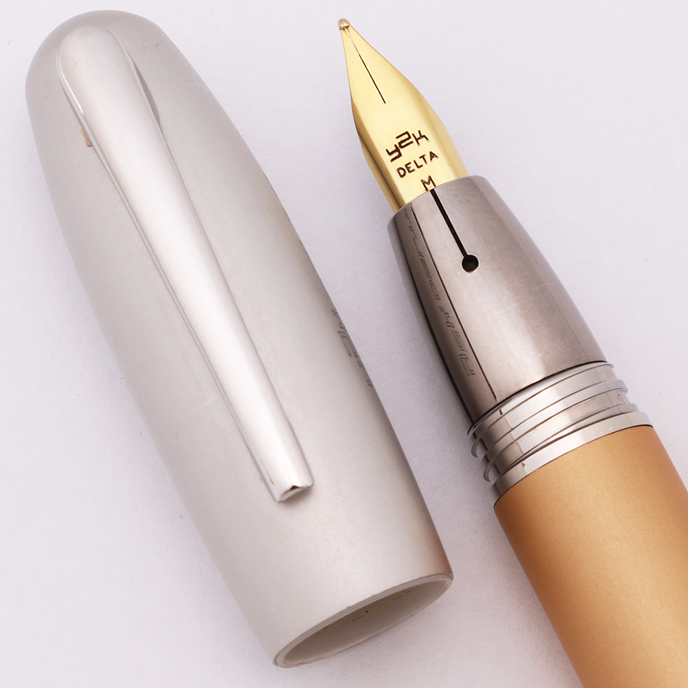 Color Matte Gold barrel with matte silver cap. Chrome trim, end piece on barrel, and section. The end piece on the barrel is threaded for posting.