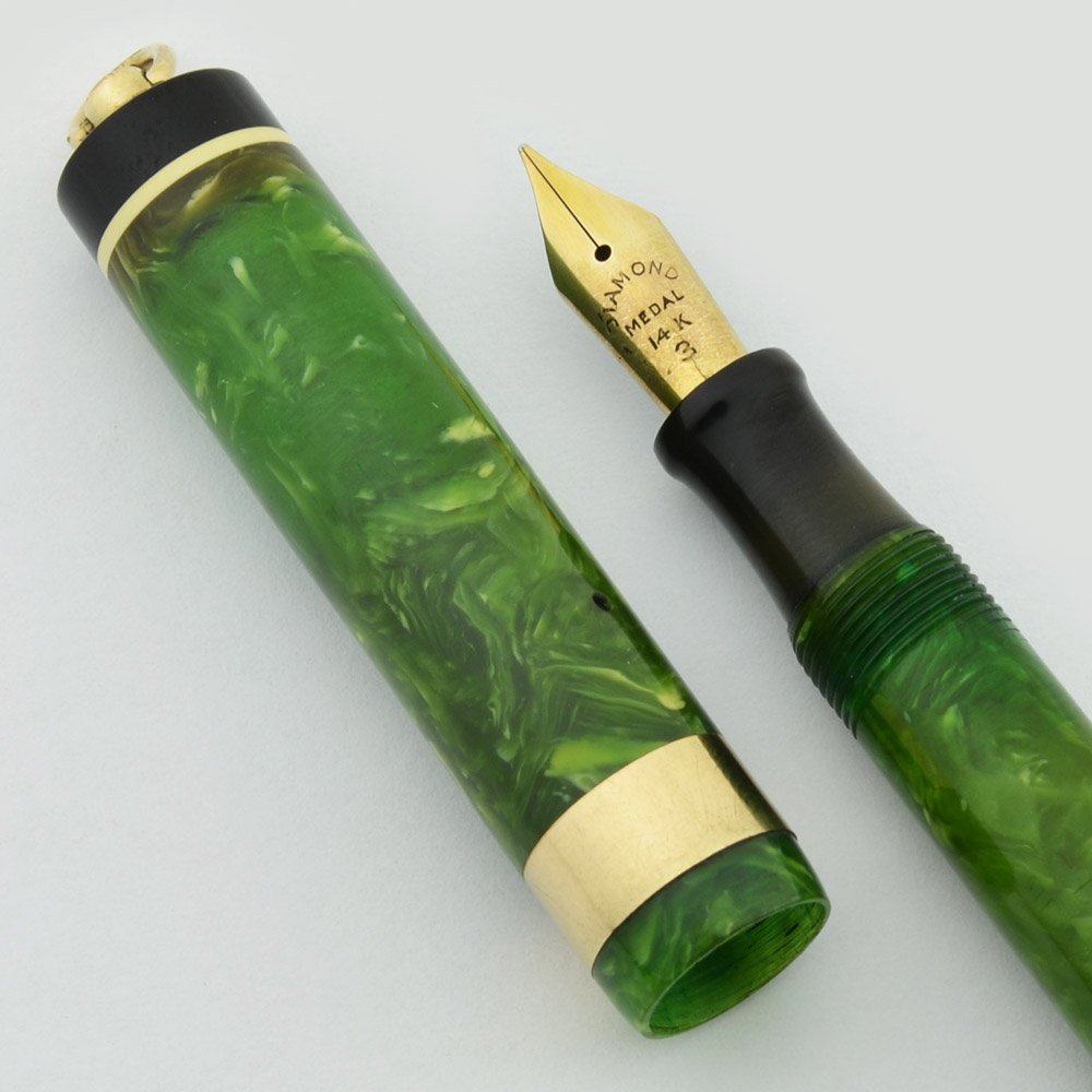Condition Very nice condition except for some light scratching and wear on the cap, some microscratching on the cap band, and just hints of brassing around the edges of the lever. The green has darkened to a brownish color beneath the white band on the cap, but the wide band looks great. The pen section is also discolored in a gradient. The imprint is clear and sharp. No cracks or chips, dings or dents in the barrel or cap. It's fully restored and working well.