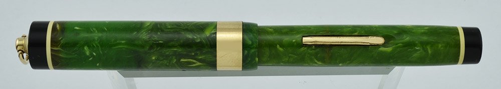 Color Green celluloid with gold plated or filled trim, a wide 1/4" cap band, and thin white insert bands on either end with black end pieces. Minor discoloration.