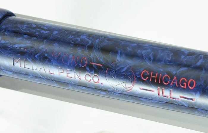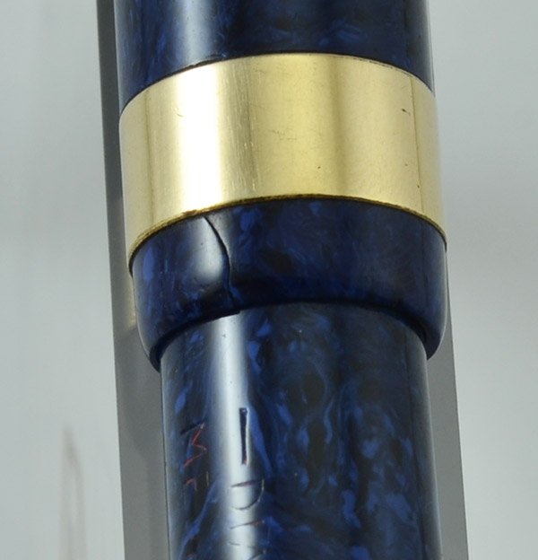 Condition Very nice condition. The trim plating looks very intact. Just hints of brassing around the edges. There's a couple tiny marks on the cap band. The color is consistent and a nice blue. The red filling on the imprint is partially faded but the barrel imprint is still legible. There is a crack on the cap lip which you can see in the photo below. There's a slight scratch above the lever and the barrel is a bit rough in texture beneath the section from the cap. It's been personalized, "Carmen." The ring does not move but is firmly attached. It's fully restored and working well.
