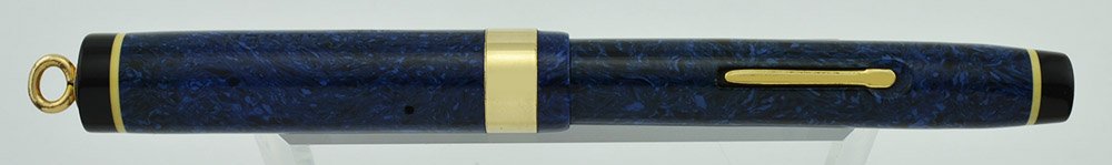 Color Blue celluloid with gold plated or filled trim, a wide 1/4" cap band, and thin white insert bands on either end with black end pieces.