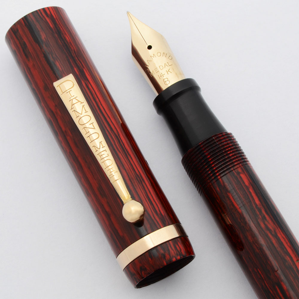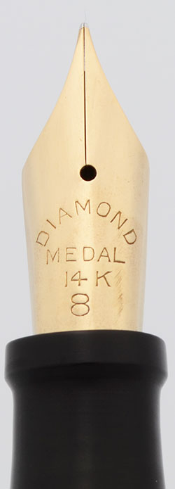 Condition Excellent + condition with no cracks. This is a large, hefty pen in an attractive color pattern and with excellent shine. The cap and barrel have light wear. The barrel has marks caused by the cap lip and a few light scratches near the end of the barrel. The cap has a thin scratch near the ball end of the clip. The cap band and clip have some microscratching but no plating wear. The enameled emblem on top of the cap is beautiful. The imprints are crisp.