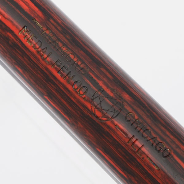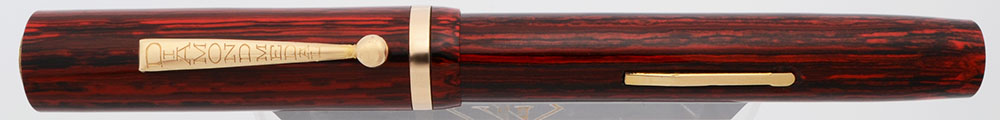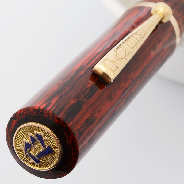 Color Red and black woodgrain celluloid. Gold plated or gold filled trim. There's an oriental-style enameled emblem on the top of the cap.