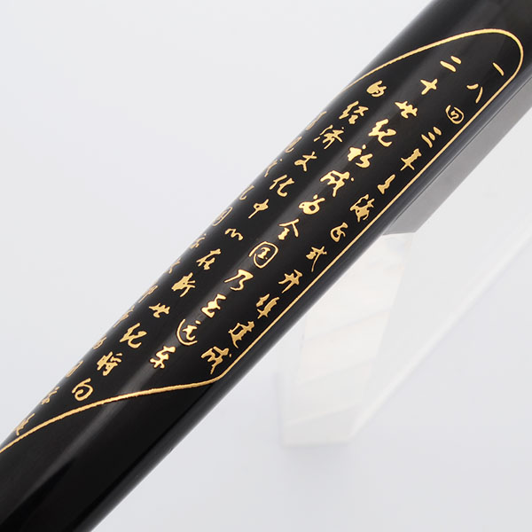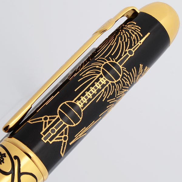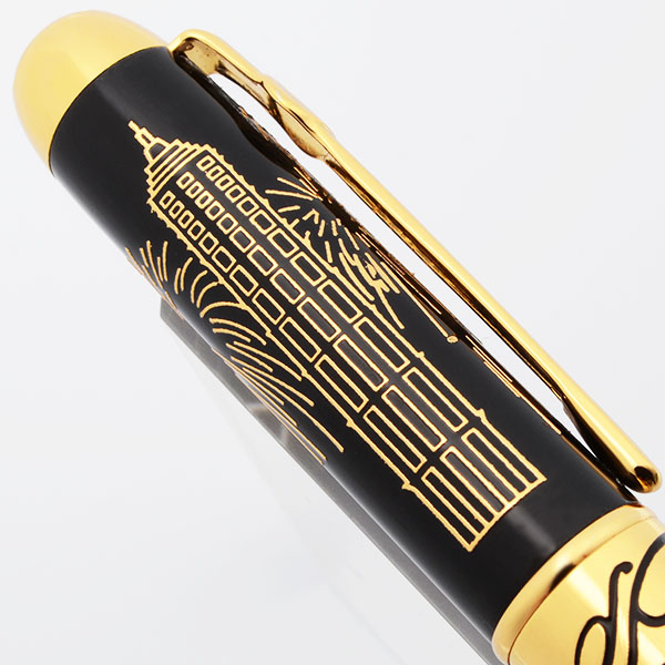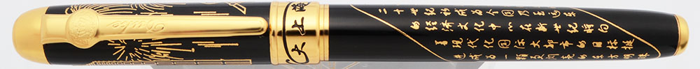 Color Cap and barrel are black Italian resin with gold patterning on the cap and barrel. The cap has a building and fireworks display and other iconography. The barrel has Chinese letters. The trim is gold plated. There is a 3/8" cap band.