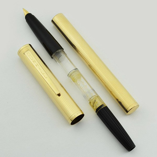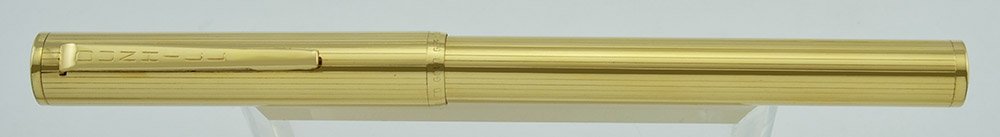 Color Gold plated cap and barrel with a pinstripe pattern. It is labeled, "rolled gold" for the technique used for the plating. The pen has a black section.