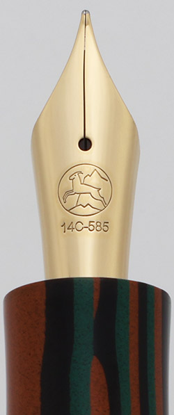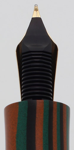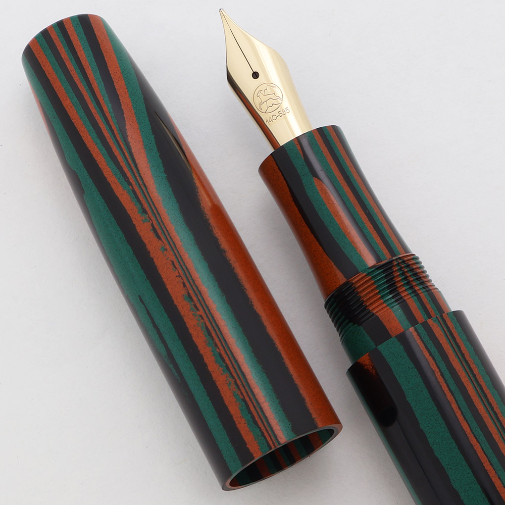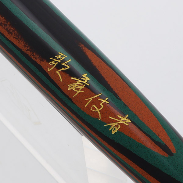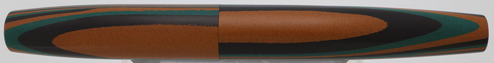 Color Green, black, and red/orange striped Nikko ebonite, custom-made for this collaboration. The barrel also has the letters "Kabuki" engraved in gold.