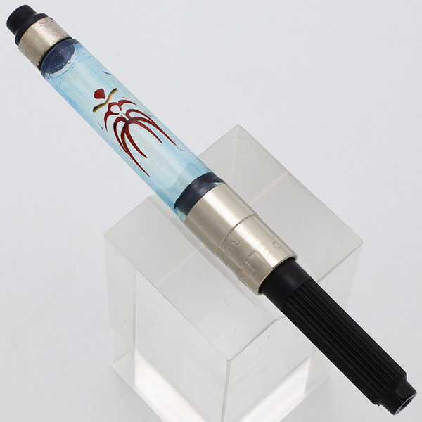Filling System Cartridge/converter. A Pelikan converter is installed; it has a maki-e decoration of a Kabuki mask. The interior of the converter is slightly stained blue.