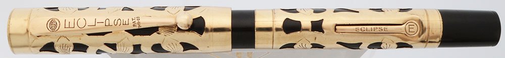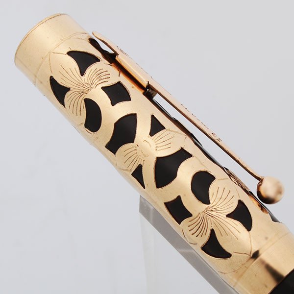 Color 14k gold filled with a trefoil floral pattern. Hard rubber section and barrel end.