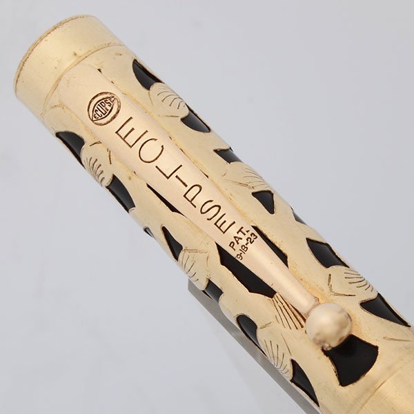 Condition Excellent condition with no cracks or chips. This is an ornate and lovely, shiny, pen. The cap and barrel have moderate scratching. There is some wear on the edges of the overlay and at the top of the cap. The end piece of the barrel has bite marks and some short deep scratches. The top area of the cap overlay has some little dings and small dents. The clip is scratched on the upper edge. The imprints are clear.