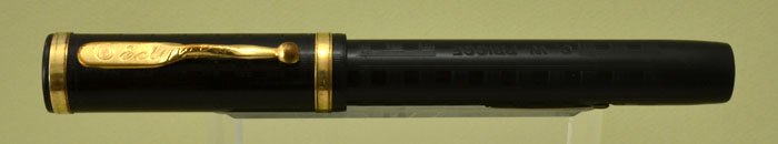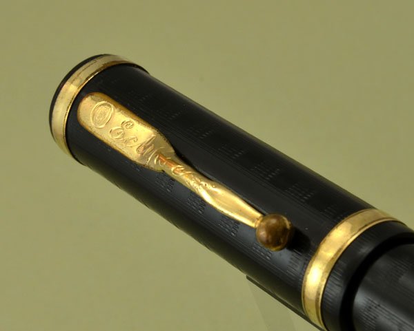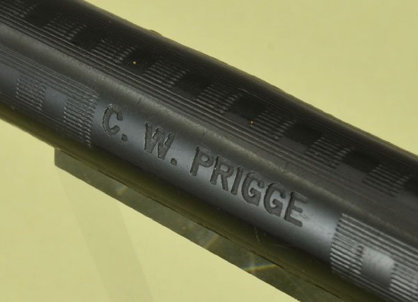 Excellent condition cosmetically and functionally. Really nice chasing, no cracks. The nib's tipping material has worn off, but the pen writes well and smoothly with a lot of flex. Some brassing on the edges of the trim. Personalized with the name C. W. PRIGGE |