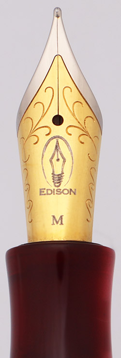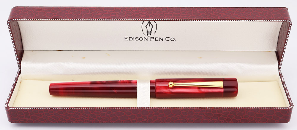Condition Excellent + condition, in Edison box, with no cracks, chips, dents, or dings. This is a beautifully colored, silky surfaced, pearlescent pen that is shiny and aglow. The cap and barrel have light microscratching. The imprint is clear.