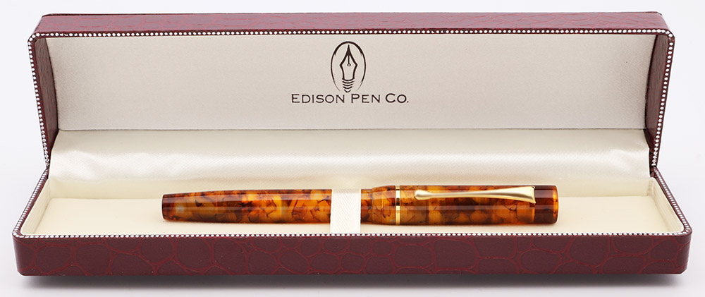 Color Flecked Tortoise, a really lovely translucent acrylic material in various browns and warm yellows. Gold trim and clip. Edison medallion on top of cap. Flat top with a slight taper at the end of the barrel. The end of the clip is a teardrop shape.
