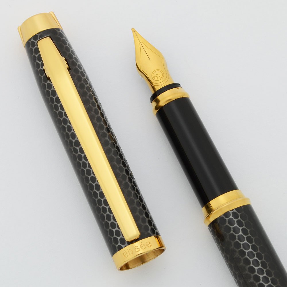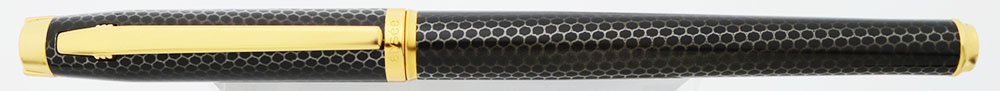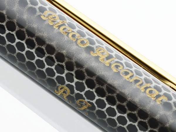 Condition Excellent + condition. This heavy, yet slim, pen has unique coloration amd a distinct honeycome pattern. Both the cap and barrel have light handwear. The barrel appears to have a small production flaw about a quarter of the way down from the trim ring, a few small white marks captured under the clear layer. The cap has a personalization, "Ricco Alcantar" on one side and initials, "A.F.", on the other side. The clip and trim are beautiful. There are no cracks, chips, dents, or plating wear. Imprints are clear.