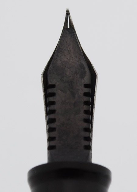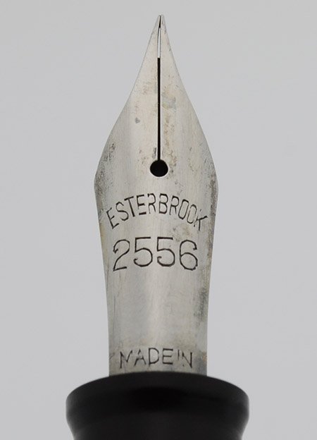Nib FINE FIRM #2556 steel nib. The 2556 nib is catalogued as Firm Fine for general writing. The tines were straightened out and it writes smoothly. It actually writes more like a medium or a medium-broad than a fine with the angled tipping.