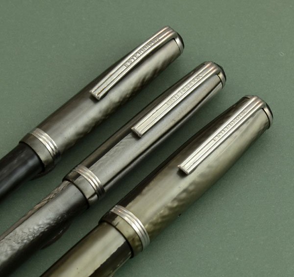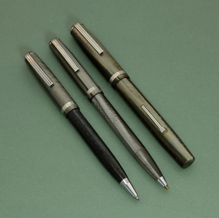 Condition | The set is in excellent condition, though the pencil and fountain pen show a little wear: the pencil has a few small melted spots on the cap and some tiny scratches on the barrel, and the fountain pen has a bit of microscratching. All told the three are in fairly impressive condition, they look great together. |