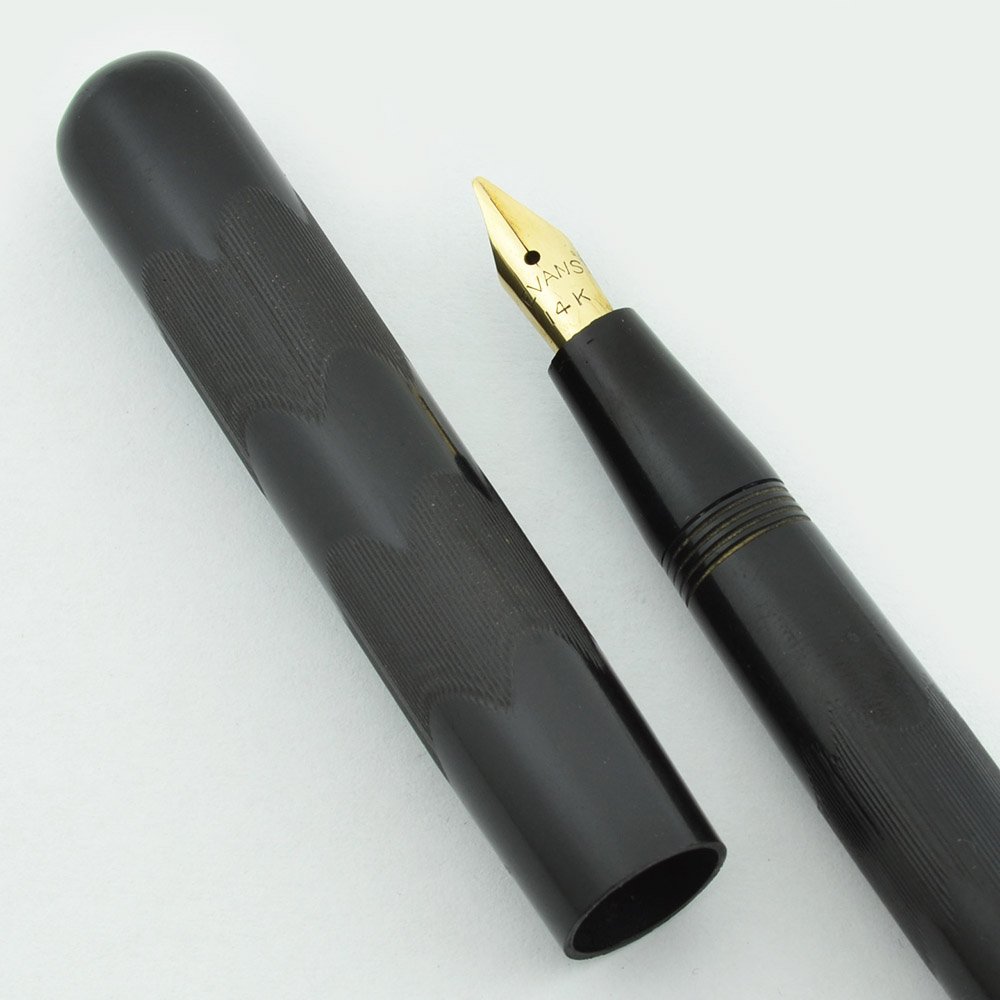 Nib FLEXIBLE MEDIUM Evans 14k nib is smooth but has only a small amount of tipping material remaining on the tip of each tine. It's fully flexible with easy line variation from medium to double broad.